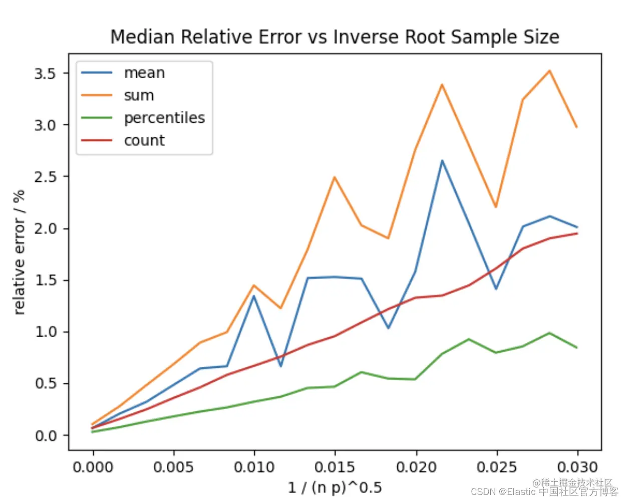 在上图中,p 是提供给聚合的概率,n 是提供的任何查询匹配的文档数。 你可以看到异常值对 sum 和 mean 的影响,但是当许多文档仍然以较高的采样率匹配时,相对误差仍然很低。