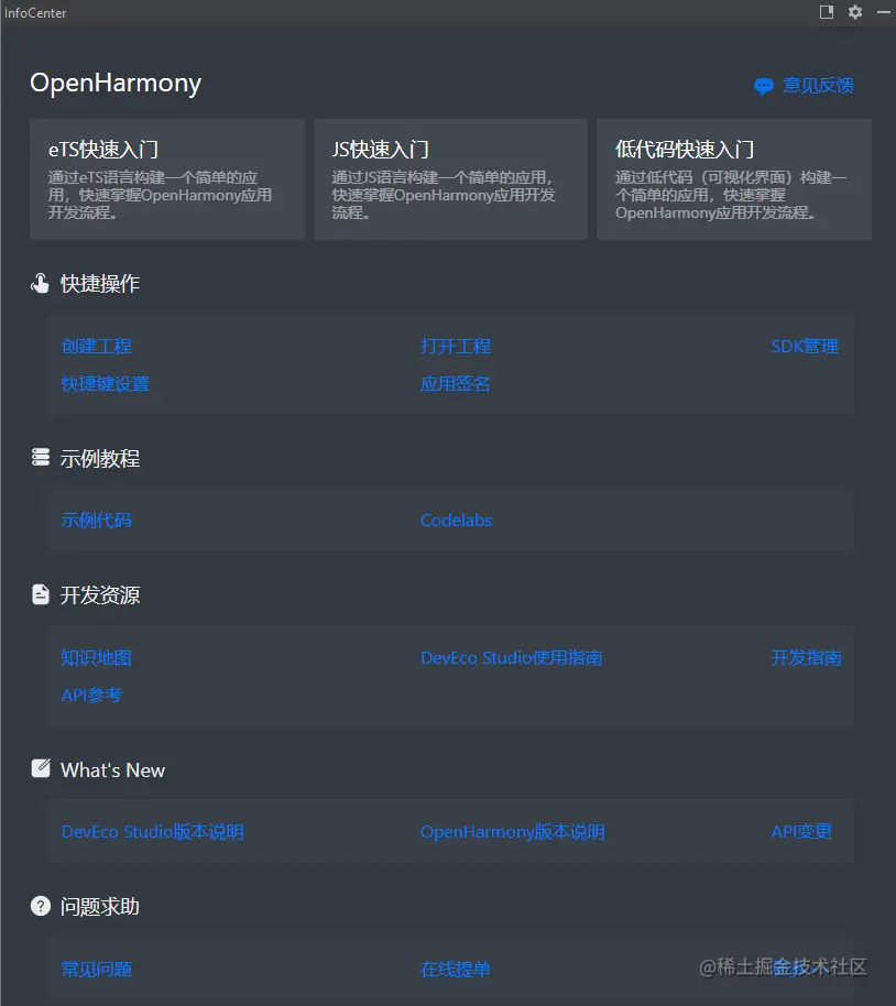 基于开发者了解、学习、开发、求助的用户旅程,我们在 DevEco Studio 中提供了一站式的信息获取平台:OpenHarmony 信息中心,首版本支持如下能力: