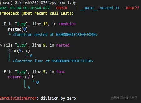 对于日志而言,没有错误堆栈的日志是没有灵魂的。Loguru 允许显示整个堆栈信息来帮助你发现问题(包括变量)。