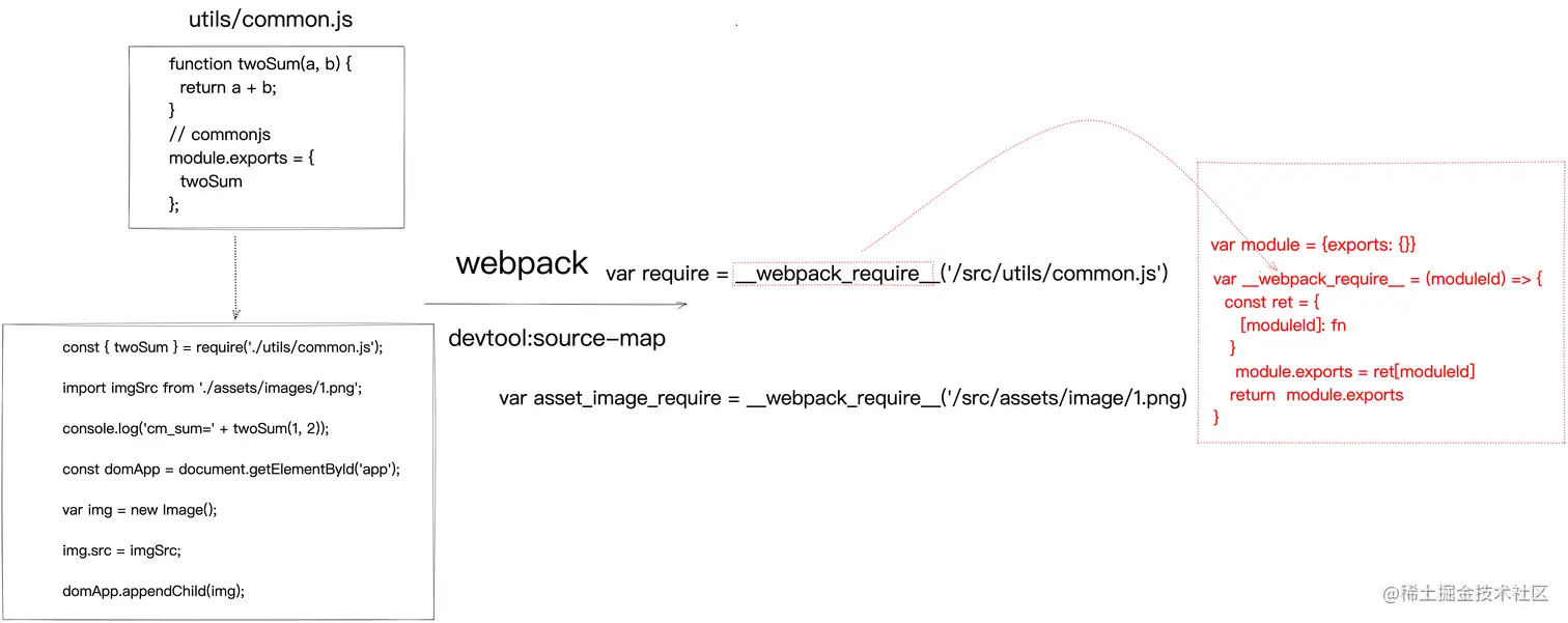 cjs使用require('/path')、或者在esModule中使用import xx from '/path'时,实际上webpack把requireorimport转变成了一个定义的函数__webpack_require__('moduleId')的可执行函数。 cjs是在执行__webpack_require__.r(__webpack_exports__)是就已经预先将__webpack_require__返回的函数体内容进行了绑定,只有在执行_webpack_require__(/*! ./utils/common.js */ './src/utils/common.js')返回函数体,本质上就是在运行时执行esMoule实际上是在定义时就已经进行了绑定,在定义__webpack_exports__时,执行了__webpack_require__.r(__webpack_exports__);动态添加__esModule属性,根据moduleId定义模块时,执行了__webpack_require__.d(__webpack_exports__, { default: () => __WEBPACK_DEFAULT_EXPORT__});,将对应模块函数体会直接用对象拦截执行Object.defineProperty的get方法,执行definition[key]从而返回函数体。本质上就是在编译前执行,而不是像cjs一样在函数体执行阶段直接输出对应内容。- 他们相同点就是优先会从缓存
