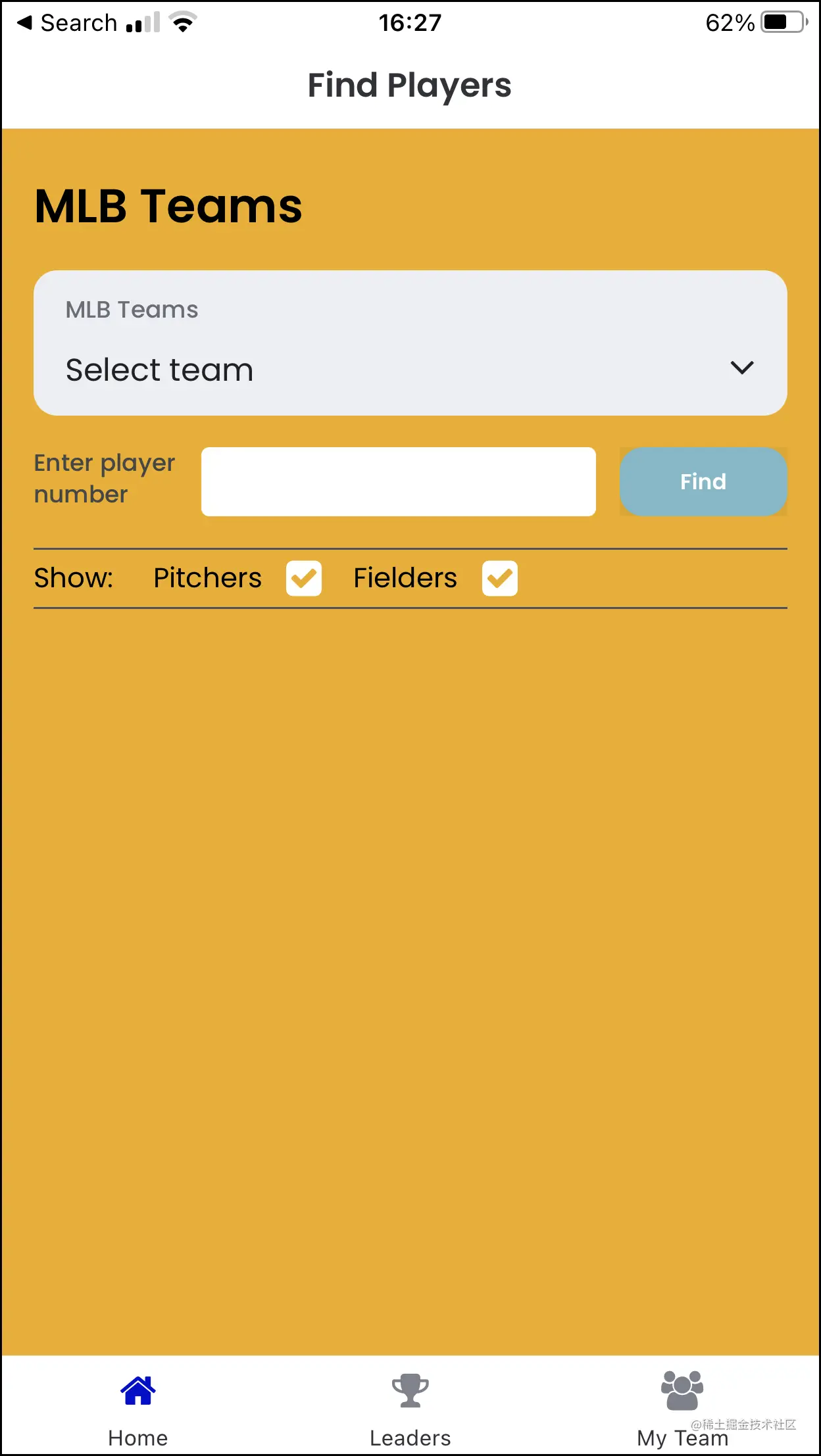 主屏幕为你提供了一个下拉字段来选择一个球队,并查看其球员。你可以查看投手、外野手或两者。
