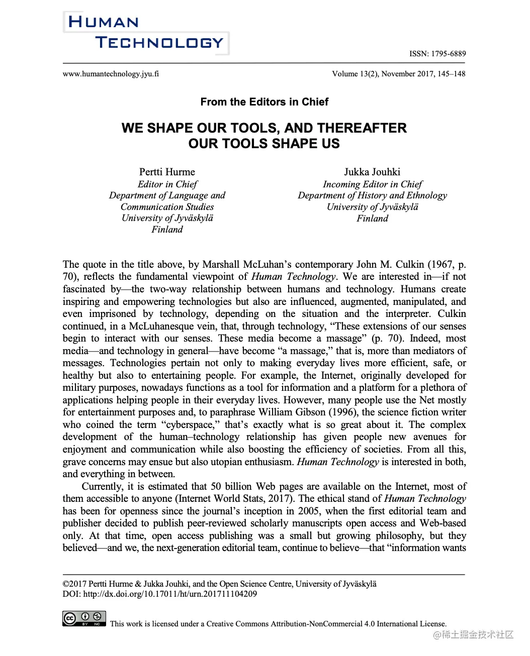 原文是“We shape our tools and, thereafter, our tools shape us” - 这句出于一位学者John M. Culkin在50年前的话,近年来又被重拾。因为智能手机这种人类发明的技术,对人类本身的未来影响太大了;同理,人工智能作为一种技术工具,它对“我们”的改变又会是什么?