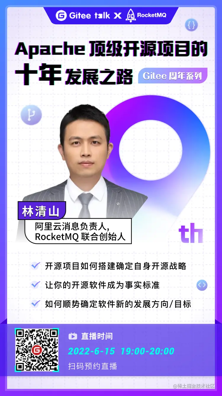 十年磨一剑。时至今日,RocketMQ 已然孵化成为 Apache 顶级开源项目。06月15日,Gitee Talk 邀请了阿里云消息负责人,RocketMQ 联合创始人林清山老师为大家带来《 Apache顶级开源项目的十年发展之路 》的直播分享。如果你对开源项目如何搭建确定自身开源战略,以及如何顺势确定软件新的发展方向,这场直播千万不要错过。
