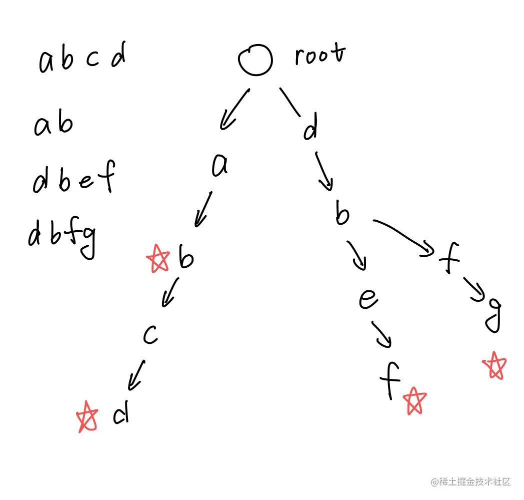 root为空节点,图中五角星的意思是标记有以该字母结尾的字符串,代码表示是cnt数组,记录以该字母结尾的字符串的数量