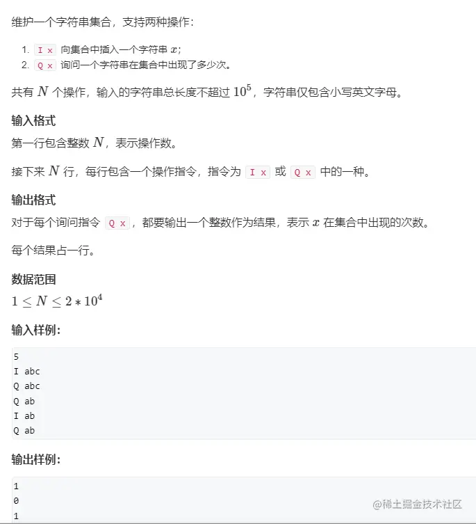 该题目中都为26个字母,所以可以开辟son[][26]数组,来映射26个字母,该数组表示的是子节点,用son[]某节点的所有子节点,son[]列映射为子节点的值,son[][]的值表示该节点是第几个加入的不重复的节点。cnt[]数组标识字符串的结束,idx用来确定节点是否存在