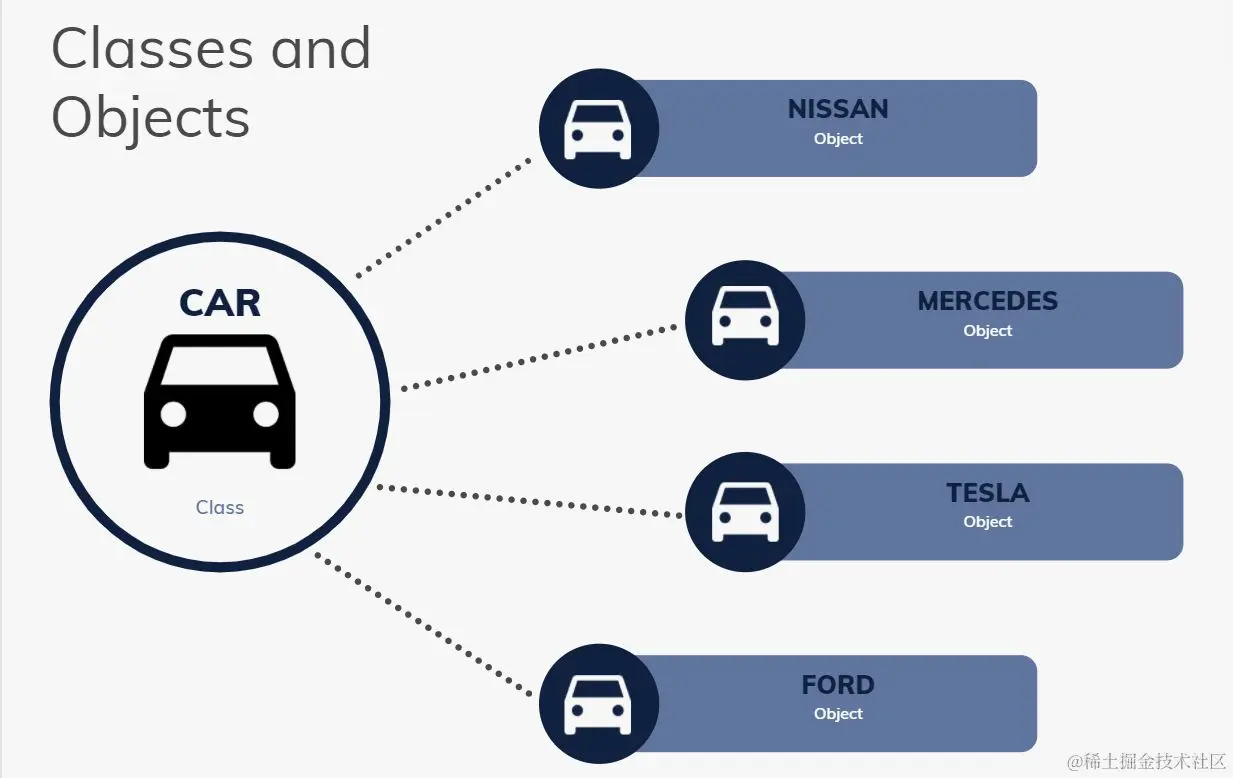 以我们经常会见到的汽车为例,日产、特斯拉、福特、丰田,这些可以理解为一个个的对象,而“汽车”则是这一系列对象的合成、集合。