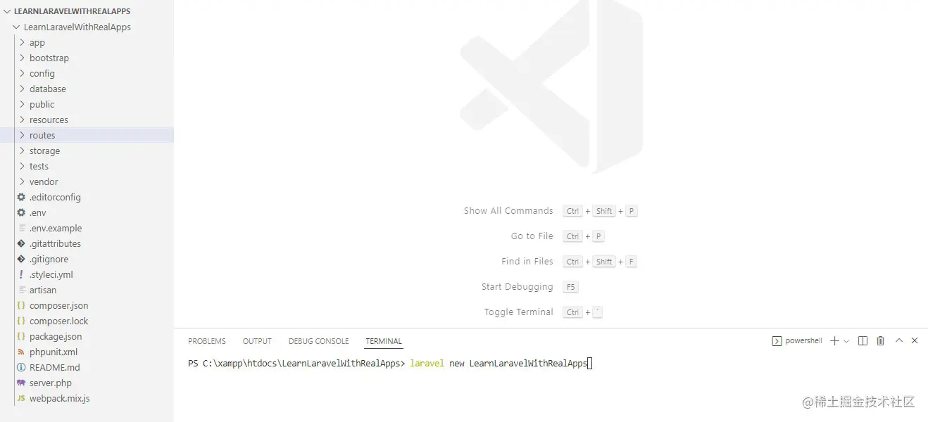 创建新的文件夹命名为LearnLaravelWithRealApps.使用Visual Studio Code打开LearnLaravelWithRealApps文件夹。在这个文件夹中,创建名为LearnLaravelWithRealApps的新项目,命令如下。
