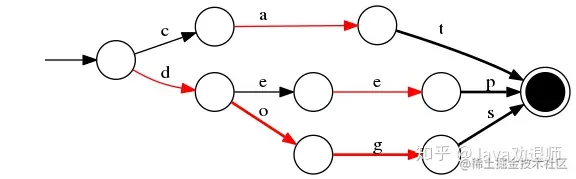 举例:对“cat”、 “deep”、 “do”、 “dog” 、“dogs” 这5个单词构建FST(注:必须已排序),结构如下: