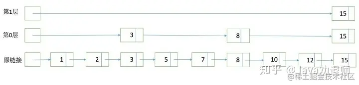 - 跳跃有一个固定的间隔,这个是需要建立SkipList的时候指定好,例如下图以间隔是;