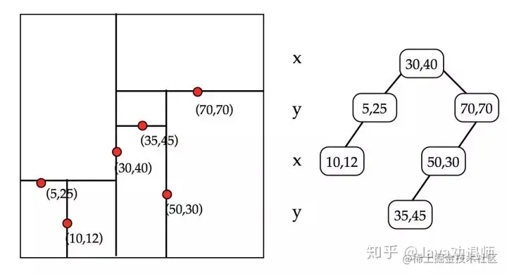 - 递归进行步骤1,2,我们可以设置一个阈值,点的数目少于多少后就不再切分,直到所有的点都切分好停止。