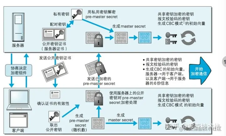 (c) 使用约定好的HASH计算握手消息,并使用生成的随机数对消息进行加密,最后将之前生成的所有信息发送给网站。浏览器验证 -> 随机密码 服务器的公钥加密 -> 通信的密钥 通信的密钥 -> 服务器 -