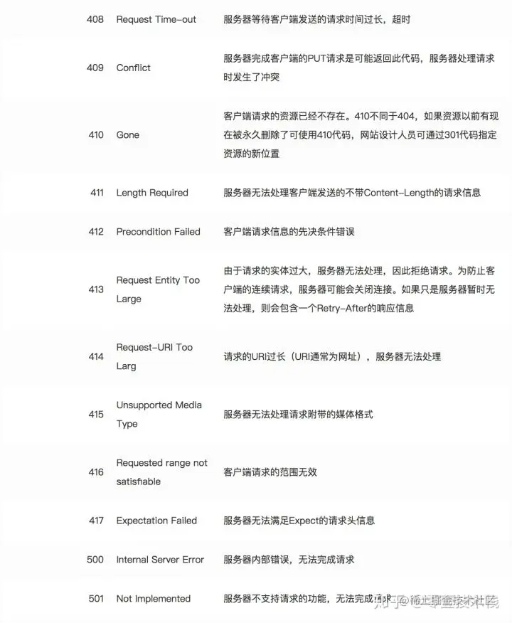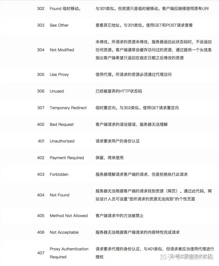 常见状态代码、状态描述、说明: 200: OK - 客户端请求成功 400: Bad Request - 客户端请求有语法错误,不能被服务器所理解 401: Unauthorized - 请求未经授权,这个状态代码必须和WWW-Authenticate报头域一起使用 403: Forbidden - 服务器收到请求,但是拒绝提供服务 404: Not Found - 请求资源不存在,eg:输入了错误的URL 500: Internal Server Error - 服务器发生不可预期的错误 * 503: Server Unavailable - 服务器当前不能处理客户端的请求,一段时间后,可能恢复正常