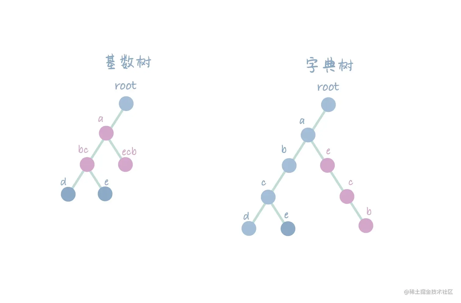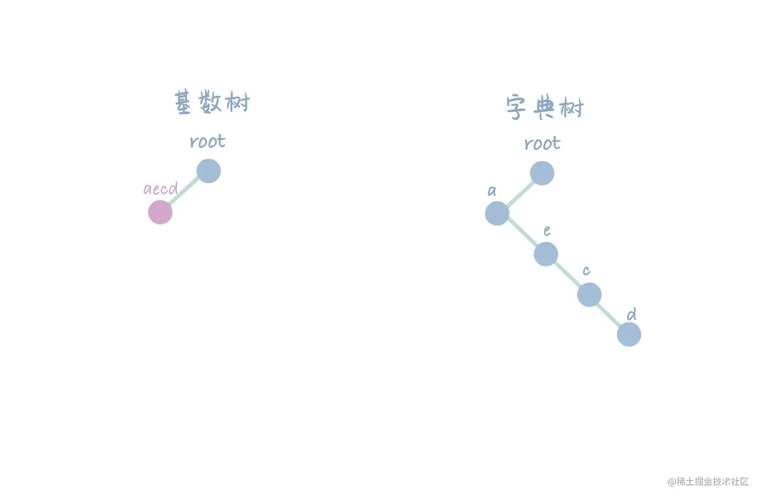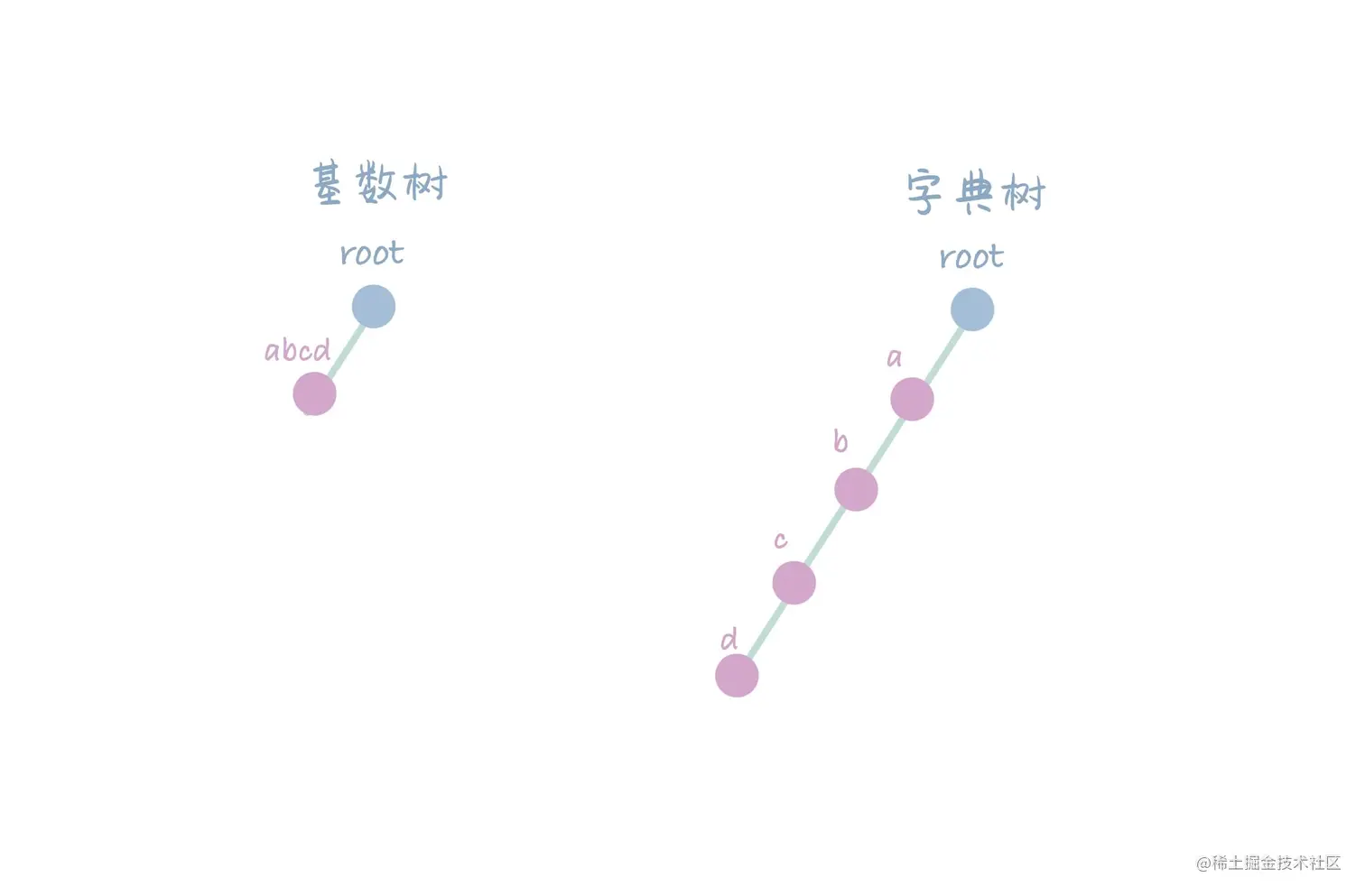 对基数树和字典树插入相同的字符串【abcd】,因为新子串无额外分叉,因此可以对子串压缩。