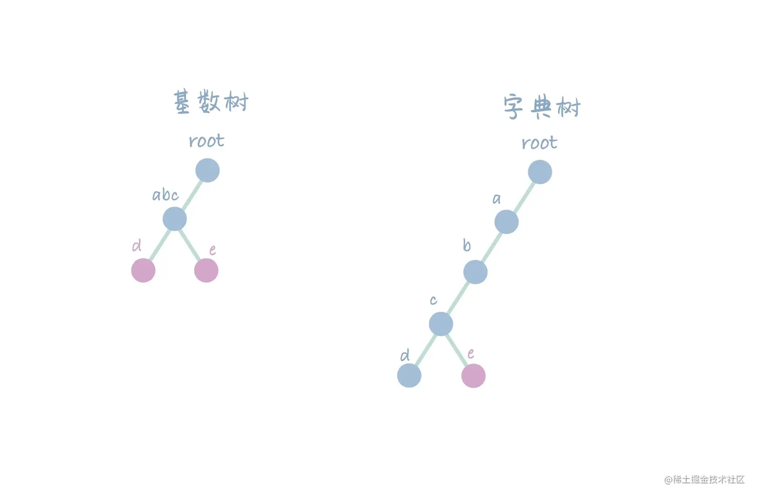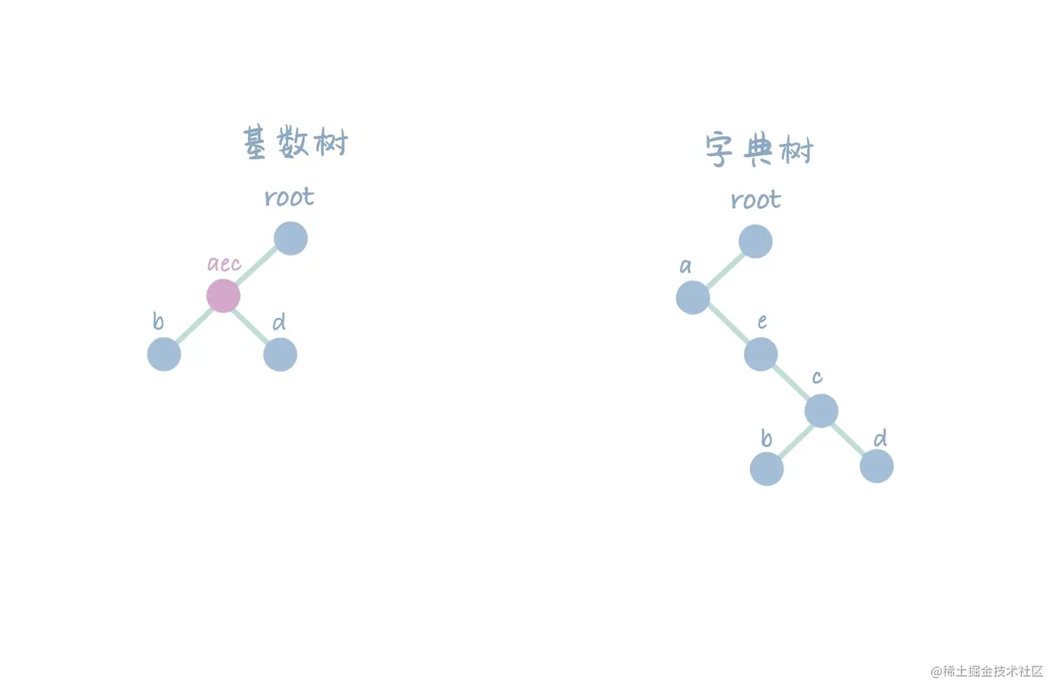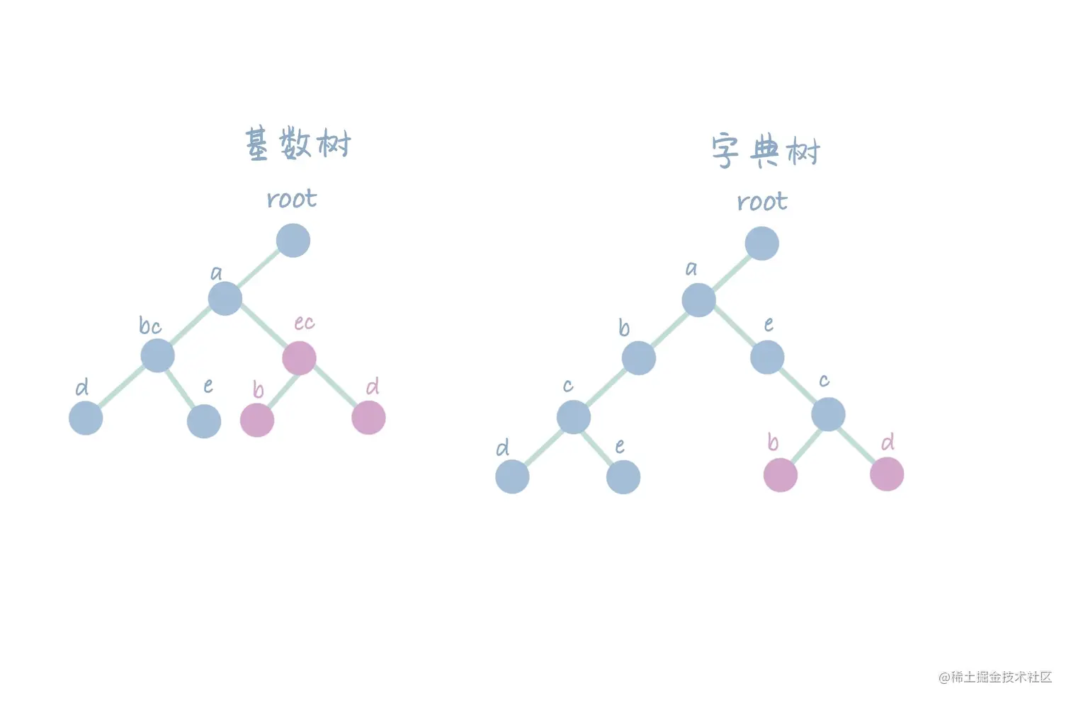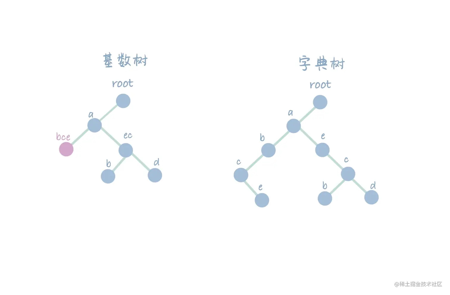 对基数树和字典树插入相同的字符串【abcd】,因为新子串无额外分叉,因此可以对子串压缩。