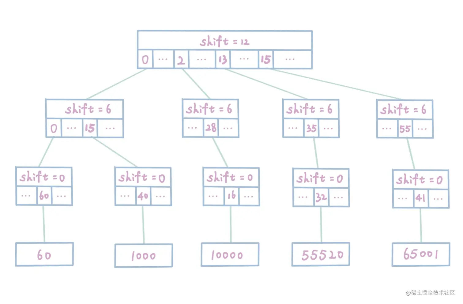 1000 >> 12 % 64 == 0所以在slots[0]中1000 >> 6 % 64 == 15所以在slots[15]中1000 >> 0 % 64 == 40所以在slots[40]中