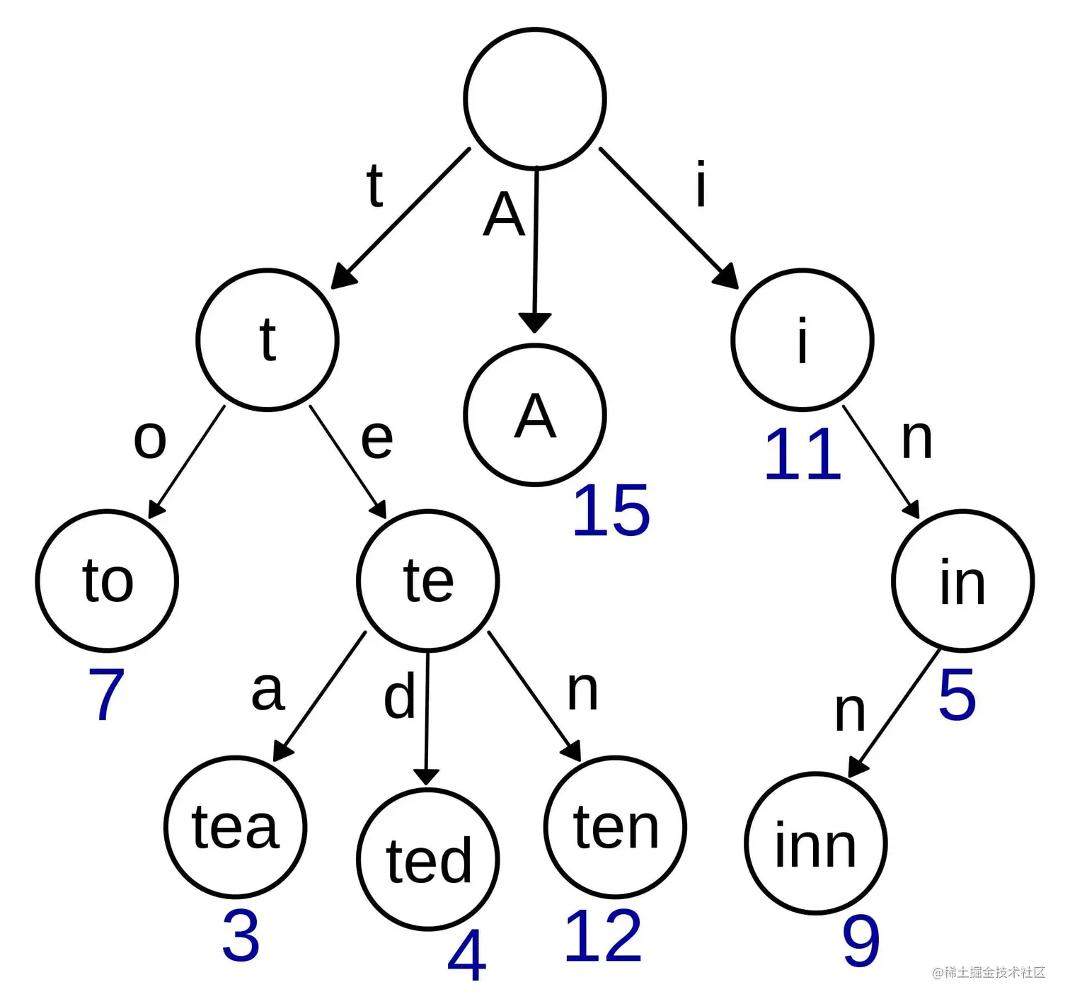对于一般字典树(Trie),每条边是由一个字母组成,同样可以从维基百科中的示例图中看出字典树的一般规律: