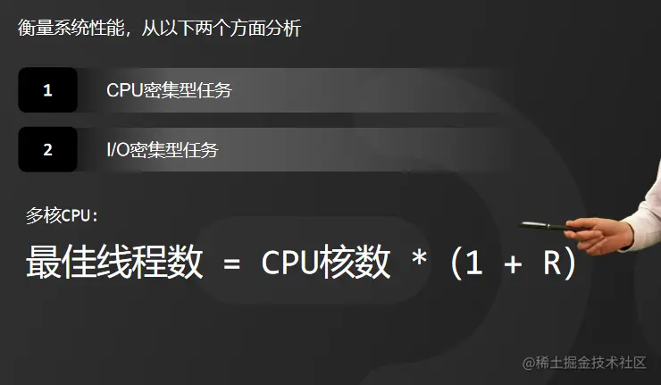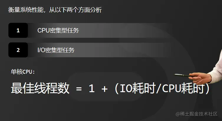 第2种情况,而对于I/O密集型任务而言,我们假设CPU计算和I/O操作的耗时比是 1:1,那么2个线程是最合适的。如果CPU计算和I/O操作的耗时比是 1:2,也就是说3个线程是合适的,这样CPU和I/O设备的利用率都可以达到100%。根据这个推测,我们可以得到这样一个公式: