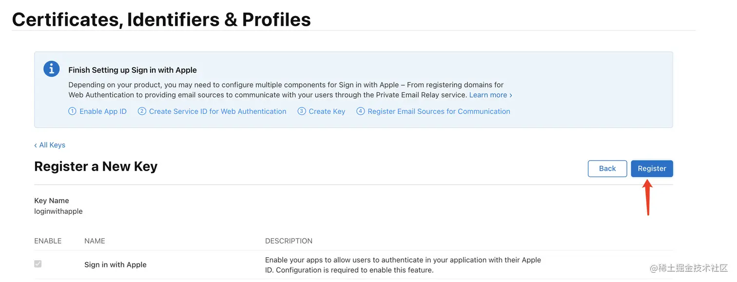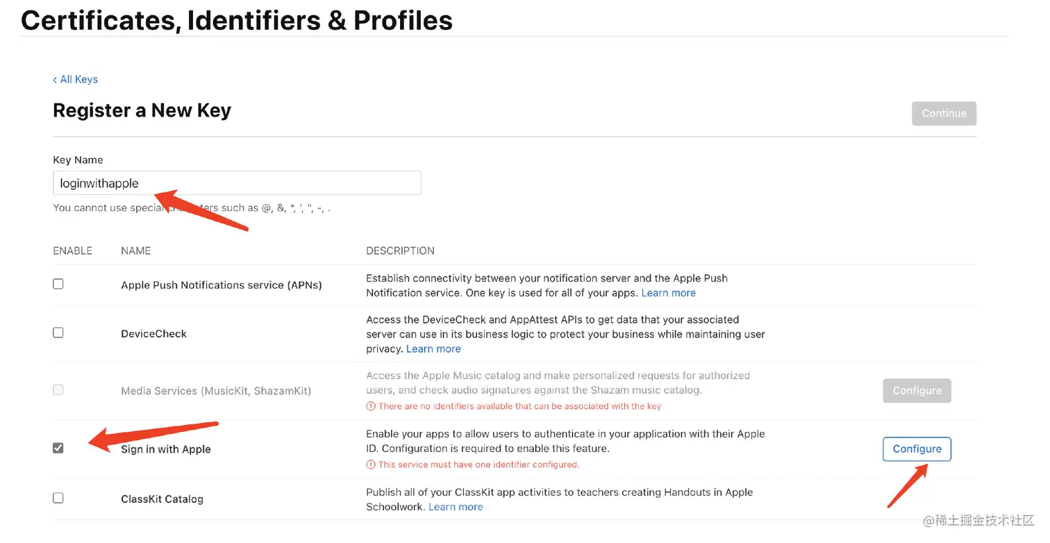 填完并勾选Sigin with apple后点击右侧的Configure进行配置,在配置页面选择需要开启苹果登录的app并保存,然后回到上一页并开始注册