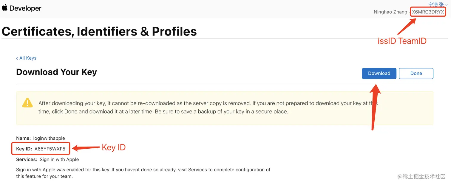 最终注册成功后会有KeyID、TeamID和可供下载的密钥文件