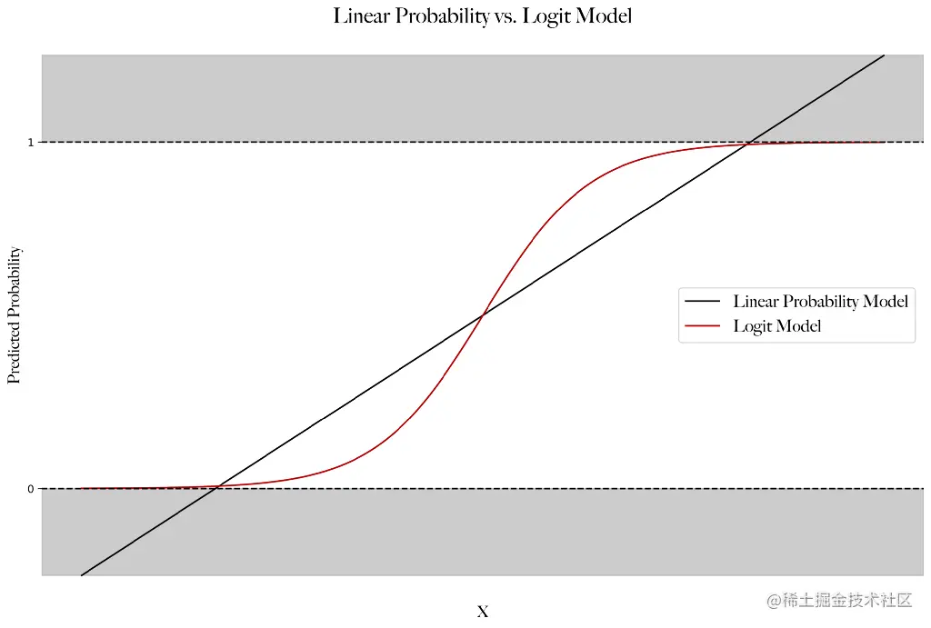 对数模型是一个特殊的案例,它允许对遵循伯努利分布的二元结果进行建模。对数模型特别有吸引力,因为所使用的链接函数(logit函数)在0和1之间是有界的。因此,所有的模型预测都在0和1之间有界,正如在概率空间中所预期的那样。下面的图1提供了一个很好的线性概率模型和逻辑回归在双变量情况下的模型拟合的视觉对比。