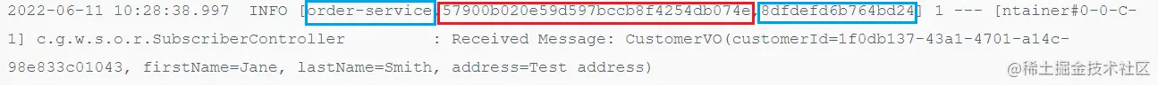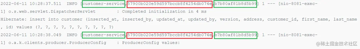 三个微服务在docker中的日志输出显示了相同的跟踪ID,用红色突出显示,并根据它们的应用名称有不同的span id(应用名称和它们相应的span id用匹配的颜色突出显示)。在customer-service ,相同的span id从REST API请求传递到Kafka发布器请求。