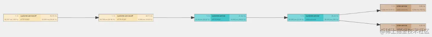 启动Jaeger用户界面。 [http://localhost:16686/](http://localhost:16686/,),通过服务搜索customer-service-bff ,点击Find Traces 按钮,这里是我们看到的创建客户跟踪:它跨越了三个服务,总共跨越了六个,持续时间82.35ms。