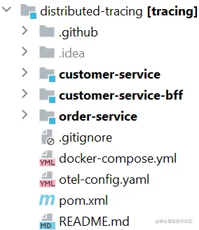 customer-service-bffcustomer-serviceorder-servicepostgres-customer:数据库,用于customer-servicepostgres-order:数据库用于order-servicejaeger-all-in-one: 运行所有Jaeger后端组件和UI的单一镜像otel-collector:OpenTelemetry追踪的引擎,它接收、处理并向后端输出追踪数据zookeeper追踪:追踪Kafka集群中的节点状态,维护Kafka主题和消息的列表kafka:pub/sub事件流处理平台