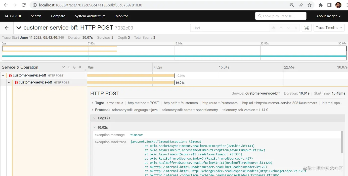 让我们在docker中暂停我们的customer-service PostgreSQL数据库,并重复从customer-service-bff 创建客户的流程。我们得到了500 internal server error ,正如预期的那样。在Jaeger中检查,我们看到下面的跟踪,异常堆栈跟踪抱怨SocketTimeoutException ,也是预期的。