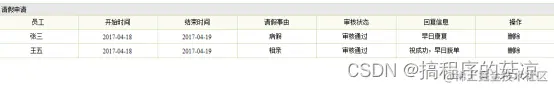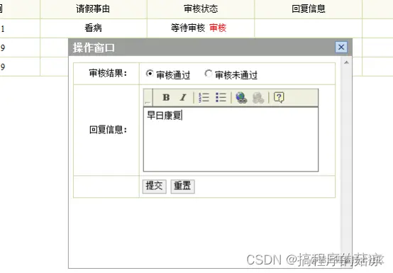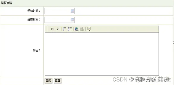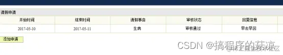 1.描述:普通用户输入用户名和密码进入系统后,可以在线申请请假,输入请假时间,点击提交按钮即可,还可以查询请假是否批准。