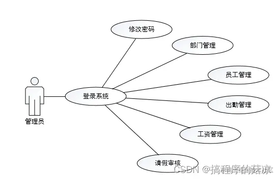 管理员是系统的管理者,其中包括六大功能模块,管理员拥有系统的最高权限,可以操作部门、员工、工资等信息,对所有的信息进行更改,适应公司的变化。用例图如图2.1所示: