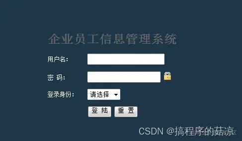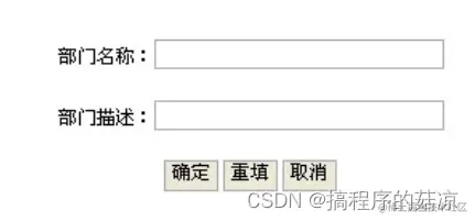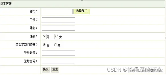 1.描述:在此页面主要是输入员工的基本信息,包括姓名、性别、年龄、部门编号、登陆账号、密码等,年龄检验输入是否为数字,是否为空也是通过form表单中的onsubmit="return checkForm()来检查。