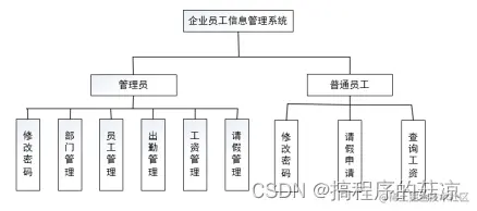 本系统针对的是企业员工信息管理系统设计的,根据需求分析,系统分为两大功能模块:管理员模块和普通员工模块。如图