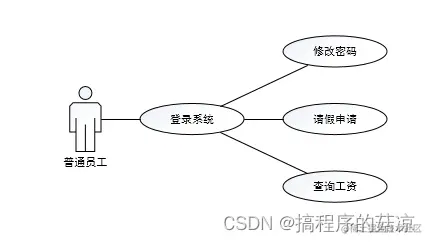 出于安全性的考虑,普通员工用户只有请假申请、浏览工资和浏览出勤等功能,其他的删除修改功能都没有设计。普通员工用例图如图