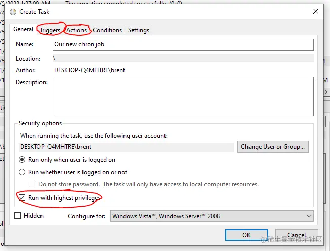 命名你的任务,为自己写一个描述--最重要的是选中 "以最高权限运行 "的选项当你完成这些步骤后,进入 "触发器 "选项卡。