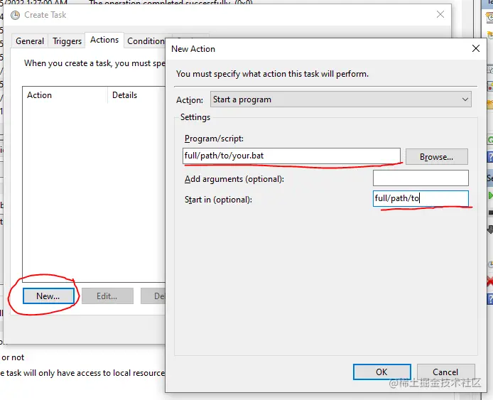 在 "行动 "选项卡上,点击 "新建"。在出现的弹出窗口中,要么在 "程序/脚本 "栏中输入你创建的.bat文件的完整路径(包括文件名),要么点击浏览并导航到.bat文件并点击确定。