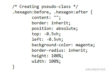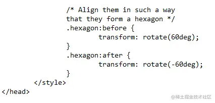 这个属性用于将形状的线条旋转60度,形成一个完美的六边形。CSS伪元素是一种造型类型,用于为元素的某一特定部分设置样式。例如,它为形状的第一行设置样式。所有这些内容都在形状的内容之前和之后应用。我们可以以这种方式应用任何特征。