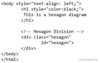 在文本之后,我们将声明六角形的代码。DIV是一个像HTML中的表格一样的容器。那是用来在一个直线位置上包含对象的。在DIV主体内,声明CSS类和ID名称,以便在形状的DIV容器上应用所有功能。关闭所有打开的标签,即Div、body和Html。