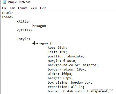 为了实施,打开记事本并开始编写HTML代码。在标题部分,我们将标题名称作为一个六边形;这将出现在标签中。朝着内部CSS前进。在Style标签里面,我们建立了一个六角形类的解释。