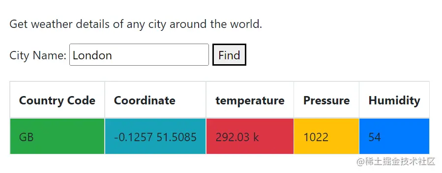 然后我们将创建以下HTML来创建FORM,并渲染API调用后传递的天气数据。