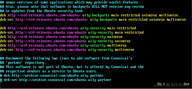 如上图,我们只需要把粉红色的网址改一下即可,将所有红色网址里的".unbantu"前面的“hk.archive”或者是别的(具体记不清了)替换成“old-releases” (因为old-releases是下载源)