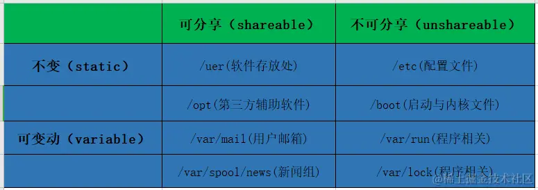 4、FHS依据文件系统使用的频繁与否与是否允许用户随意修改而将目录定义成为四种交互作用的形态: