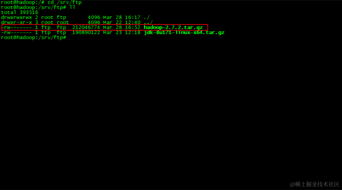 一、传入成功后,打开CRT 连接上相应的虚拟机,进入ftp目录查看是否有Hadoop压缩包;