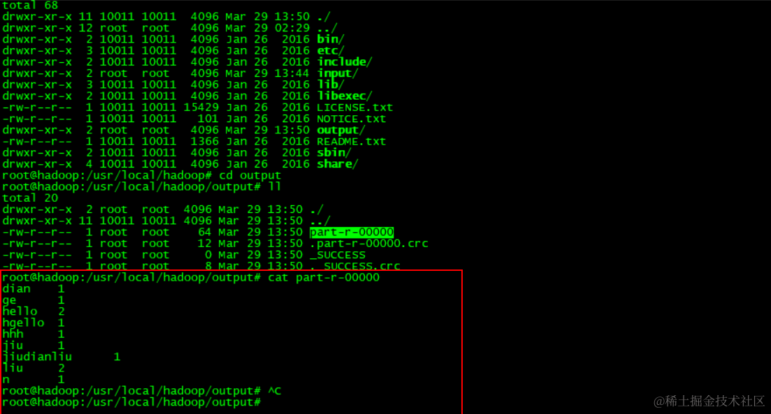 # cd .. //后退一步,因为下面的命令只能在hadoop文件夹下执行
