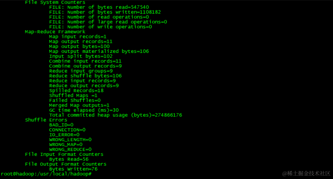 # echo hgello jiudianliu hello n hello hhh jiu liu dian liu ge > info.txt //自己编写的文件 用于检测单词统计是否成功也是检测应用环境是否搭建成功