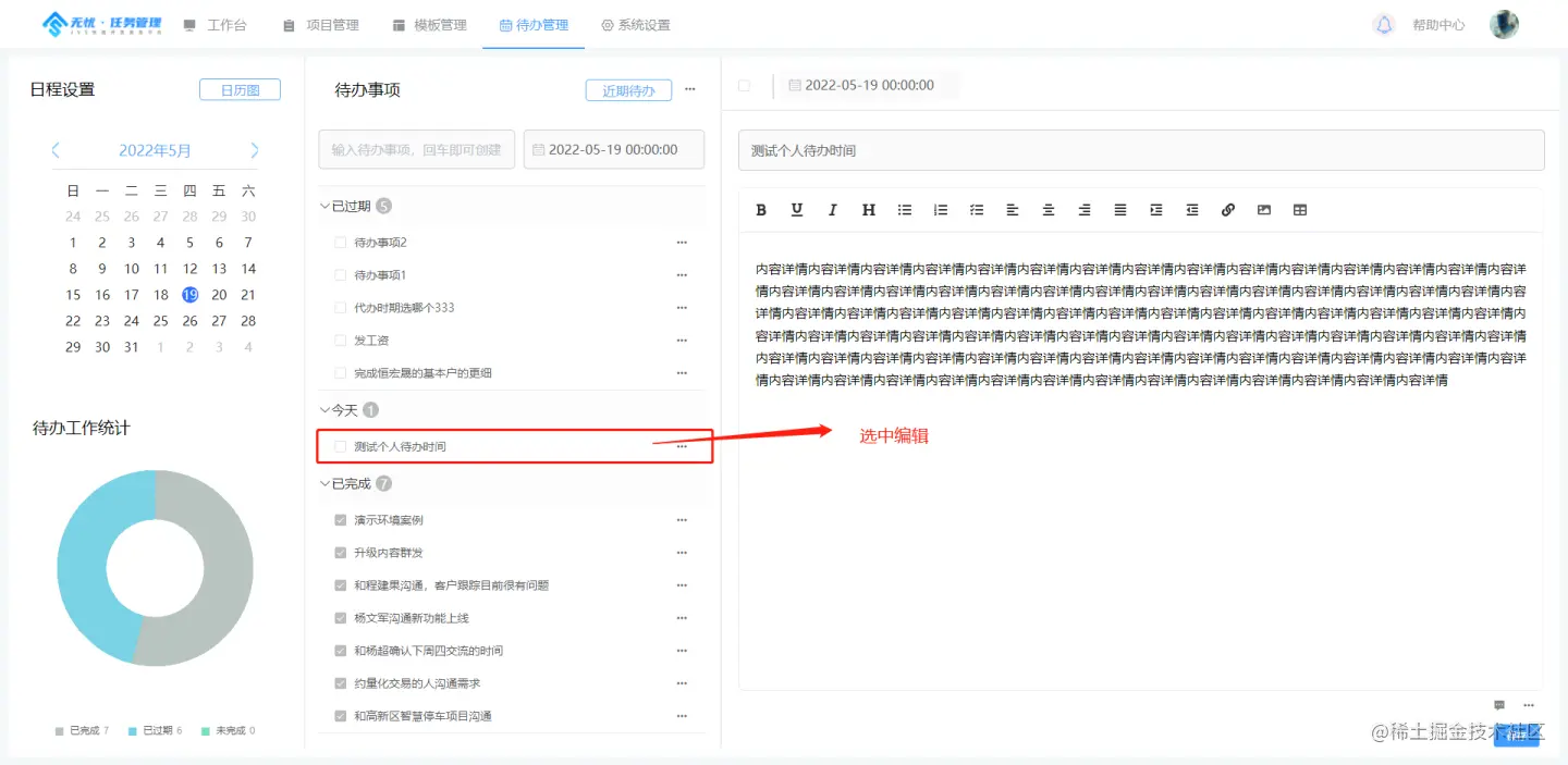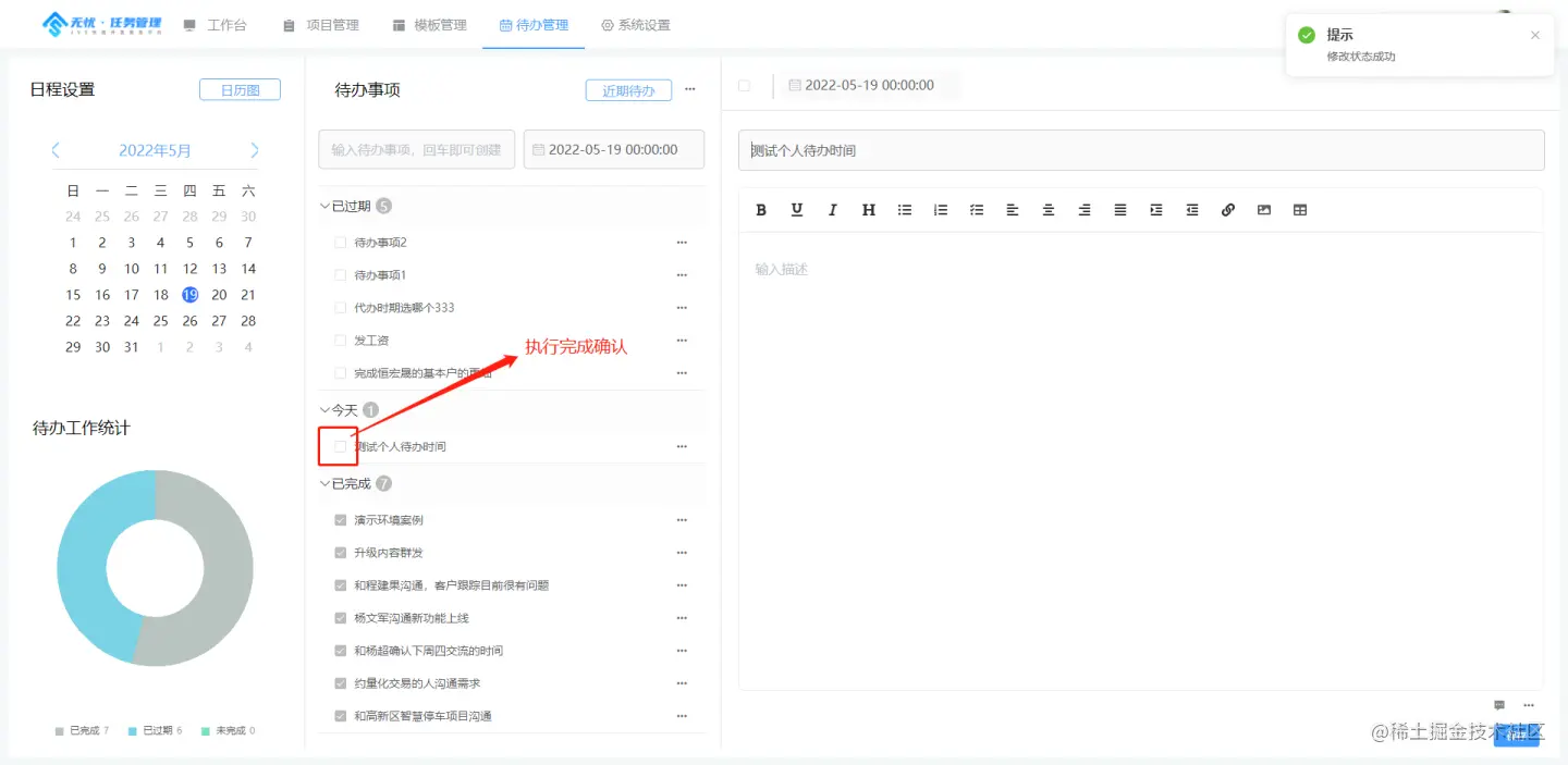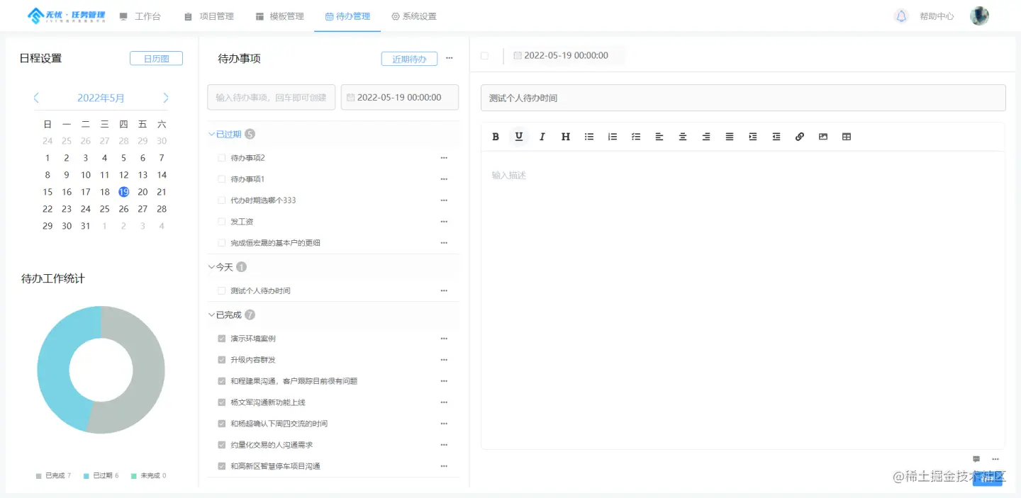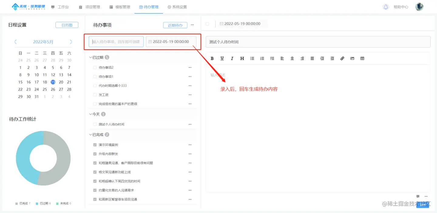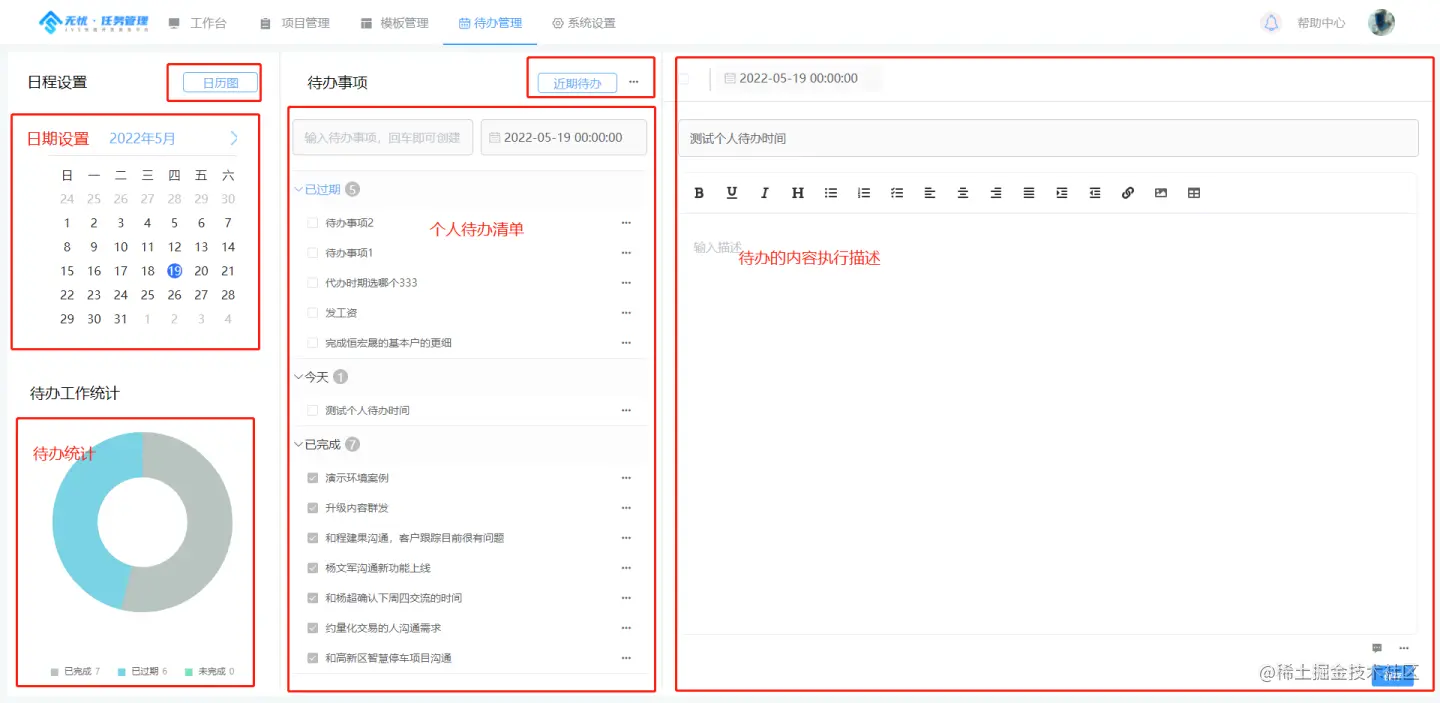 个人待办相对与任务的执行计划,个人待办侧重于时间点与执行的独立性,项目-计划更多侧重于 计划性与团队协作, 待办本质就是个人每日执行的待办清单以及快捷记录。
