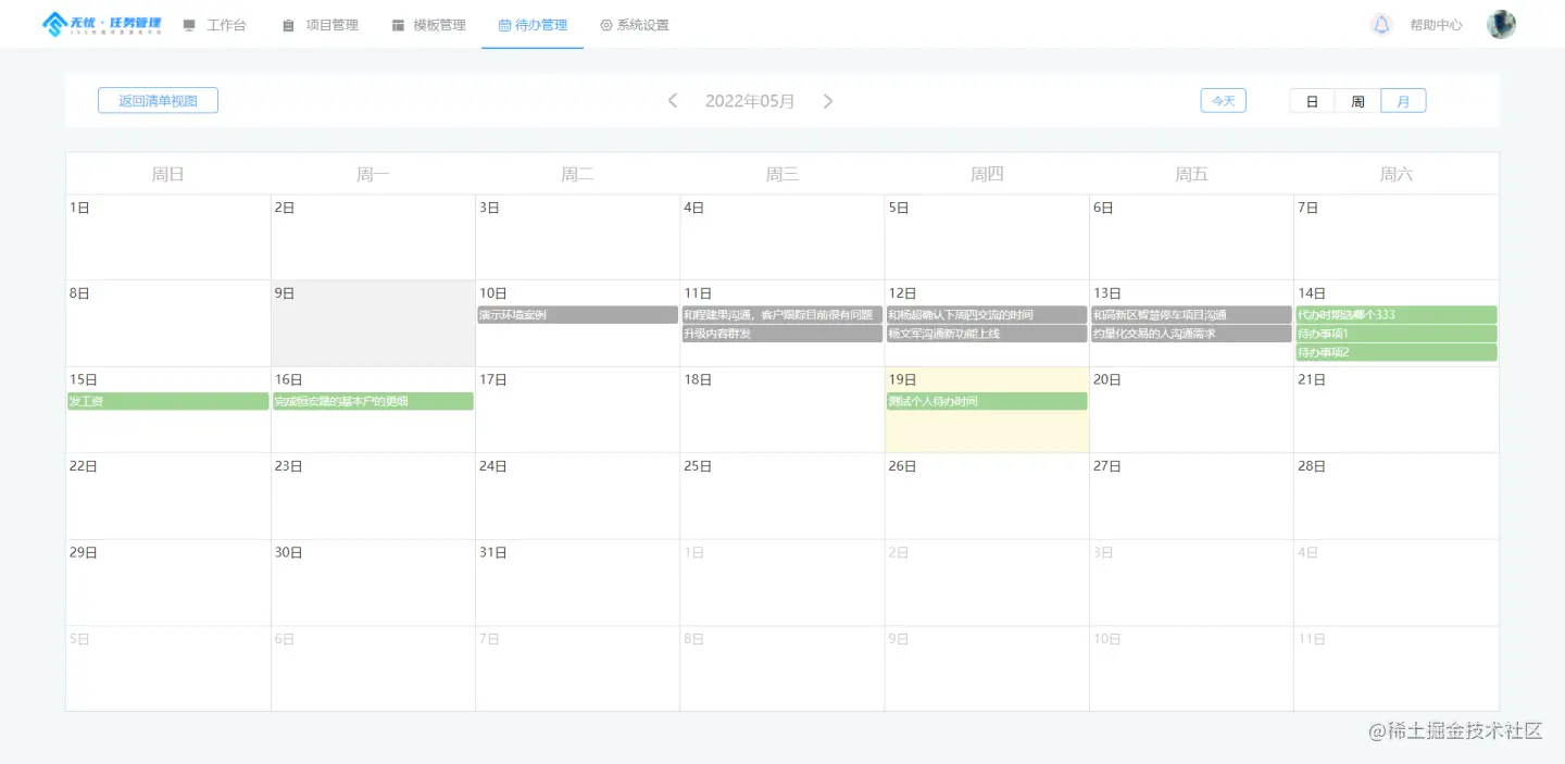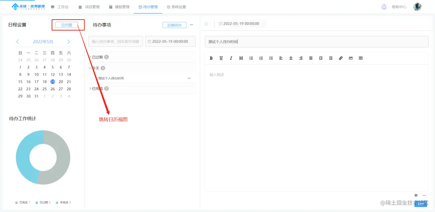 如图所示,待办包括日历设置、简单汇总统计、待办列表、待办的详情记录