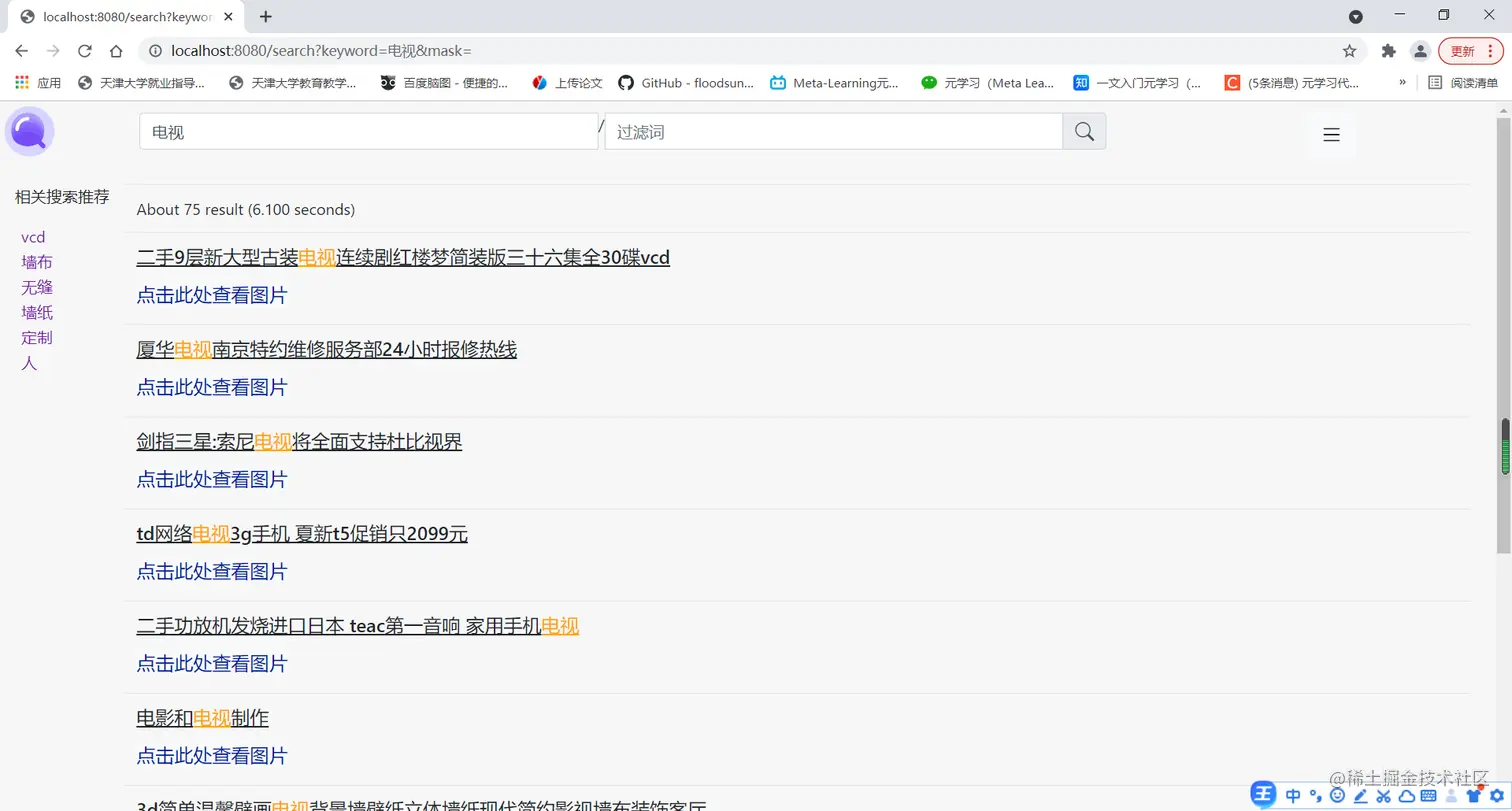 搜索结果界面:其中可以关键词搜索,词过滤,搜索结果是按照相关度排序后展示的,左侧展示出相关词语搜索推荐,底部可切换页码。右侧展示出搜索结果,最开始为搜索结果数量和时间,每个搜索结果中“点击此处查看图片”可以查看对应图片。