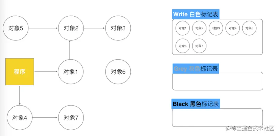 第一步: 每次创建了新的对象,默认颜色都被标记为“白色”,将他们都发在白色集合中
