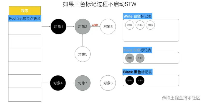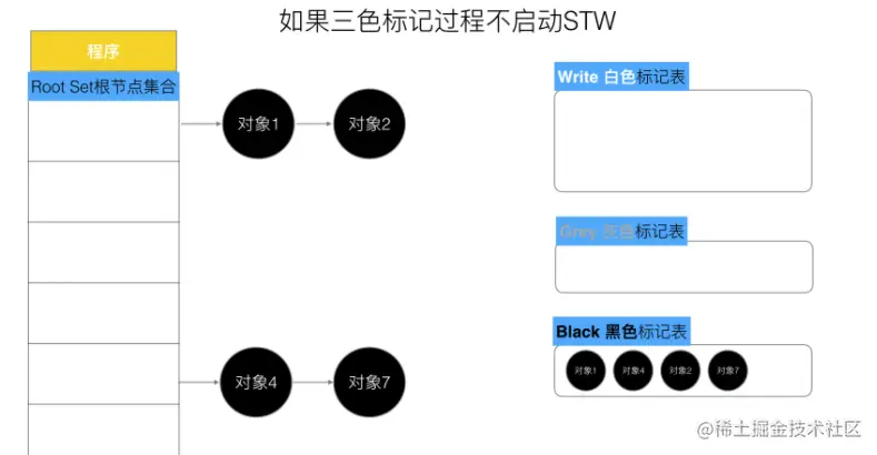 我们基于上述的三色标记法来说,它一定要依赖STW,因为如果不暂停程序,程序的逻辑该表对象引用关系,这种动作如果在标记阶段做了修改,会影响标记结果的正确性。