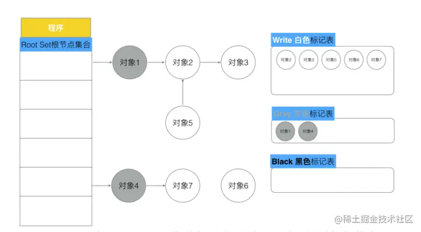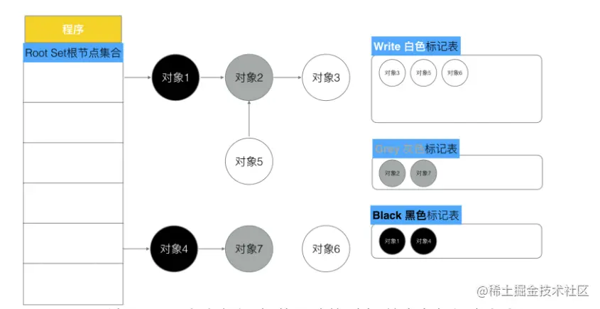 然后按照正常三色标记法的逻辑,对象2和对象7被标记为黑色